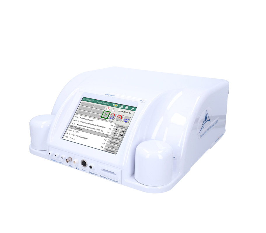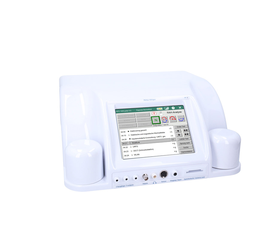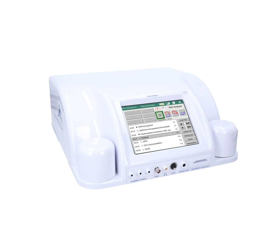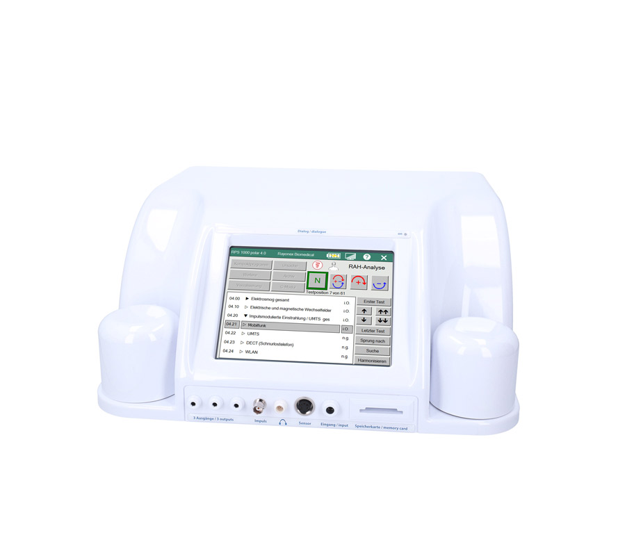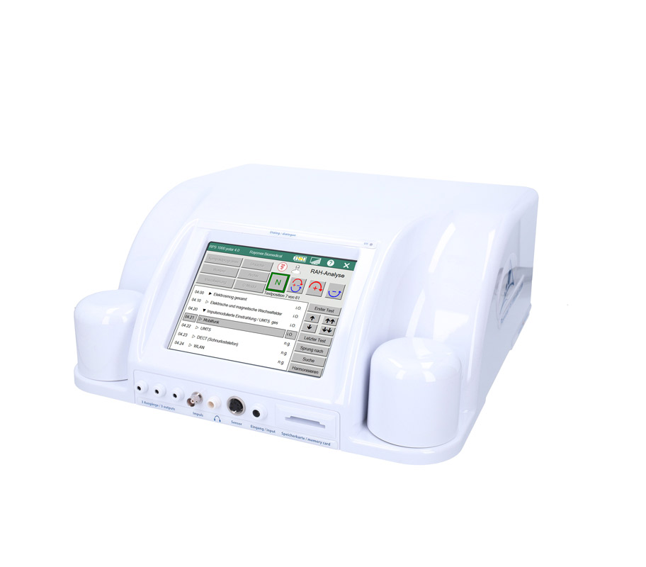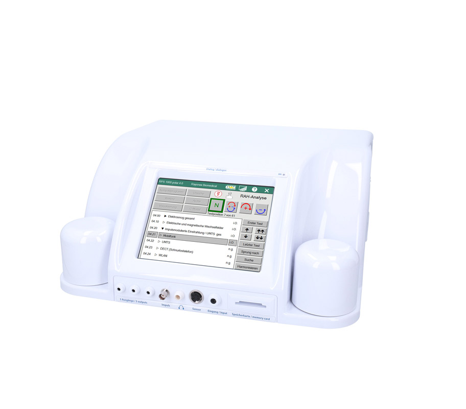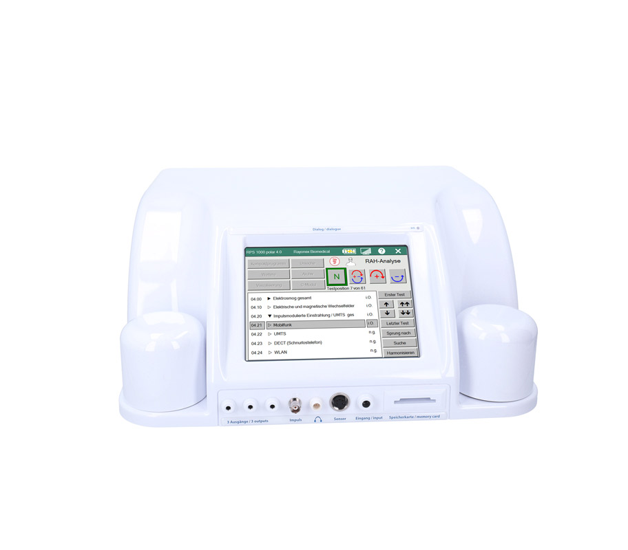 “瑞优康PS 1000极化型4.0 BB”生物能量仪中内建的分析软件可进行全面的建筑生物学频谱分析,目前包含189个常见的建筑生物学的干扰影响。这项全面的测试涵盖建筑生物学的所有领域,如电磁辐射、电离和非电离辐射,尤其是对脉冲辐射的测试,还有在生活环境中可能发生的地场压力,或甚至常见的病原体,例如霉菌感染。“瑞优康PS 1000极化型4.0 BB”生物能量仪可直接对人或动物进行生物能信息测试,或透过物质进行测试。